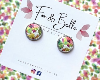 Leather studs in mustard flowers print. Hypoallergenic surgical stainless steel bezel. Mustard earrings.
