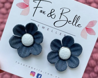 Flower earrings with leather stud. Petal stud earrings. Flower studs. Hypoallergenic stainless steel. 8mm stud. Gray earrings. Grey studs.